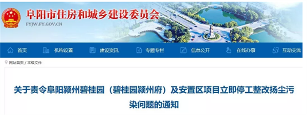 近日,阜阳市住建委网站发布了碧桂园某项目的一个处罚通知,要求立即停工整改!通知显示,该项目的施工单位中,包含有中国建筑、中天建设等知名企业!停工整改的的原因是,项目存在扬尘污染问题!具体表现在:1、施